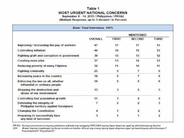 Results of the September 2015 poll showed that Filipinos think improving or increasing the pay of workers (47 percent) and controlling inflation (46 percent) are the two most urgent issues that the Aquino administration must address.