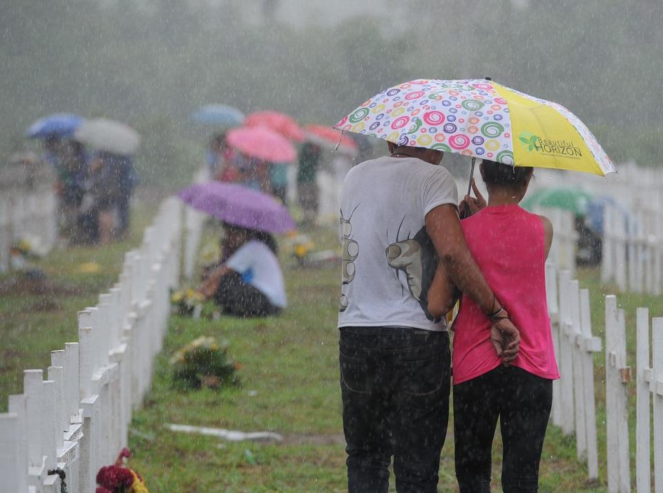 Residents brave heavy rains as they visit graveyards of their loved ones at a mass grave for victims of Typhoon Yolanda in Tacloban City, Leyte on November 1, 2015. AFP PHOTO/Ted Aljibe