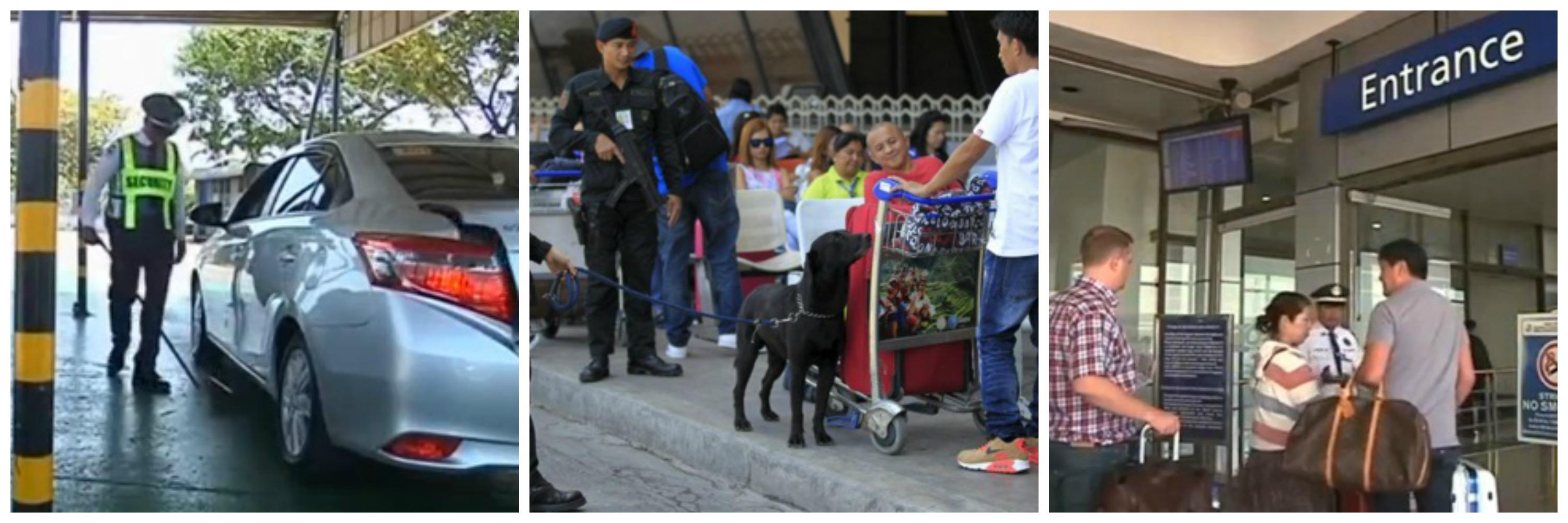 Images taken by Reuters show a civilian security guards checking the undercarriage of cars entering the NAIA complex and a bomb-sniffing dog, escorted by a handler and a policeman armed with a submachinegun, randomly checking bags as well as passengers at the airport departure bay.