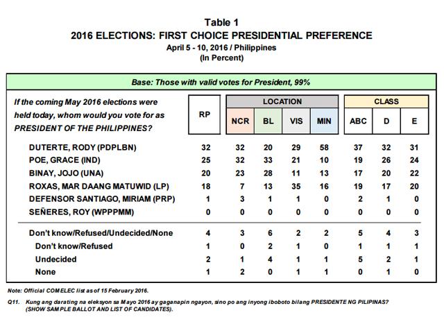 The respondents were asked: If the coming May 2016 elections were held today, whom would you vote for as President of the Philippines?