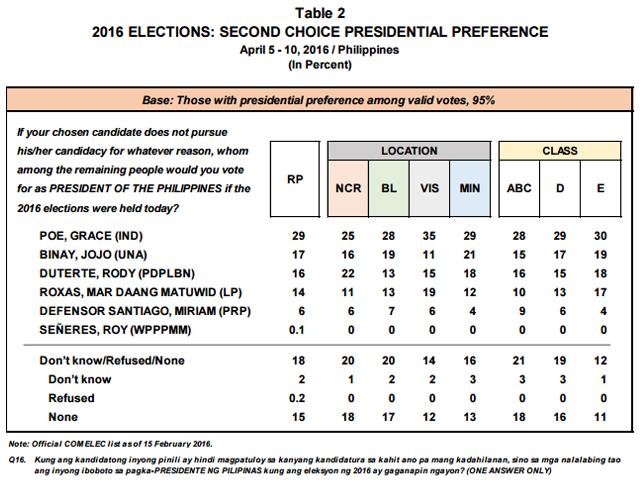 The voter preferences of Poe and Binay were unchanged from the last survey.