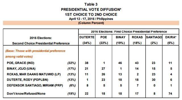 Tracking the presidential vote diffusion from 1st choice to 2nd choice, Pulse Asia revealed that Poe stands most to gain if Duterte does not pursue his candidacy.