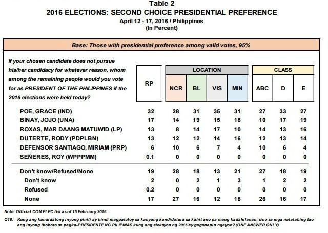 Asked who they will pick if their chosen candidate does not pursue his/her candidacy for president, respondents named their second choice, with Poe leading at 32 percent.