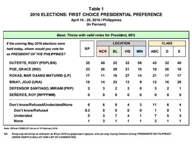 In the latest survey results, Pulse Asia said Duterte led in Metro Manila with 40 percent, Mindanao with 58 percent and all socioeconomic classes (43 percent in ABC, 32 percent in D and 40 percent in E).