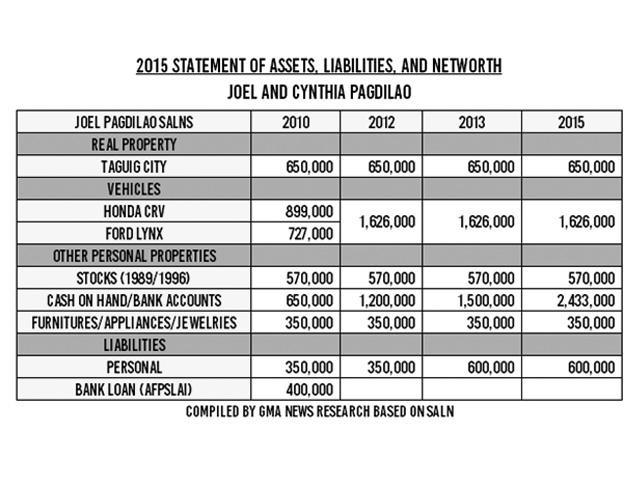 In 2010, Pagdilao declared a cash on hand of P650,000, which almost doubled to P1.2 million in 2012. In 2013, it increased to P1.5 million.