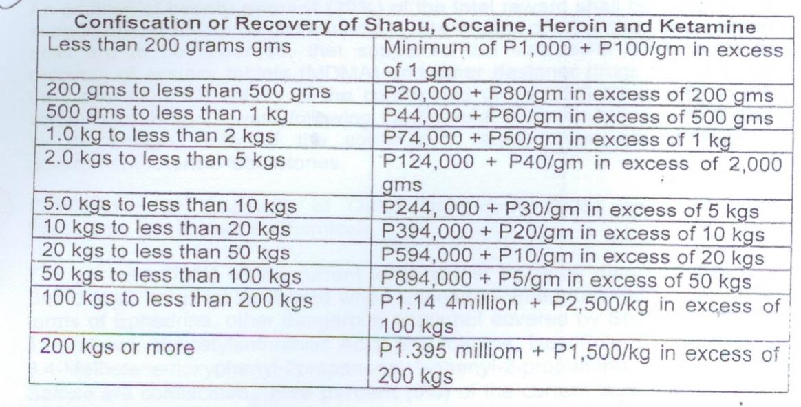 The board regulation states that the confiscation or recovery of shabu, cocaine, heroin and ketamine will have a minimum reward of P1,000 for less than 200 grams and more than P1.4 million for drugs 200 kilograms or more.