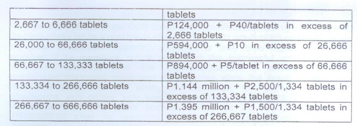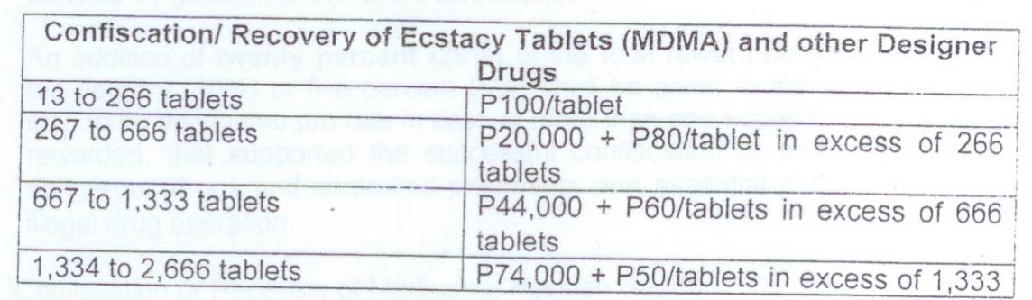 Meanwhile, the reward for ecstasy and other designer drugs will be based on the number of tablets from P100 per tablet to a maximum amount of P1.395 million plus P1,500 for anything in excess of more than 260,000 tablets.