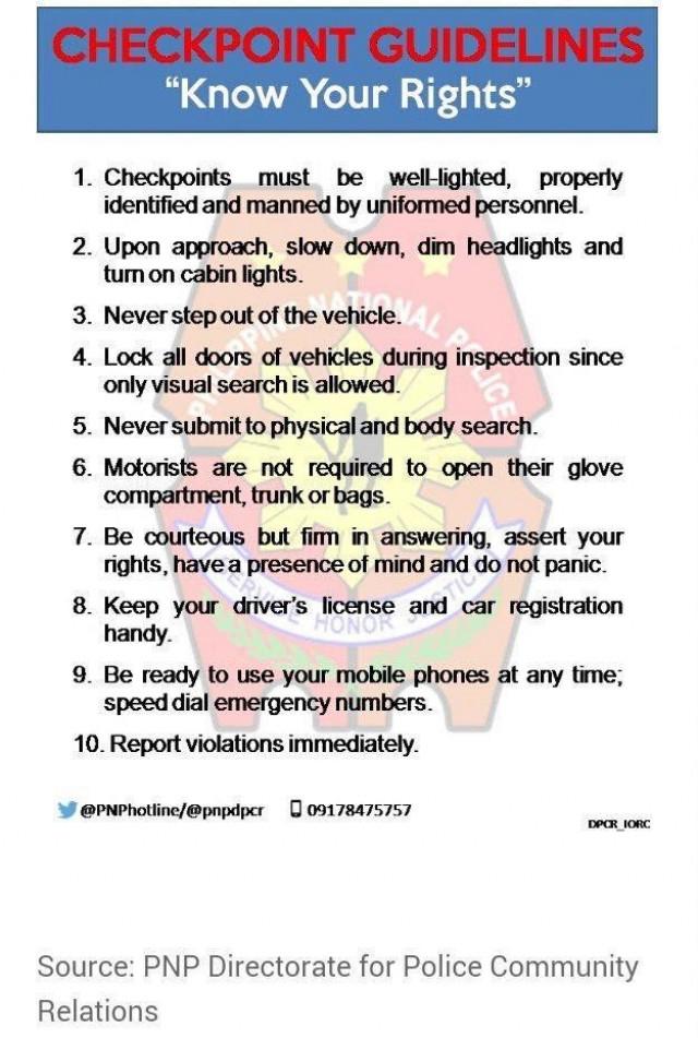 Below are the Philippine National Police’s (PNP) guidelines on how to properly respond and protect your rights during checkpoint inspection: