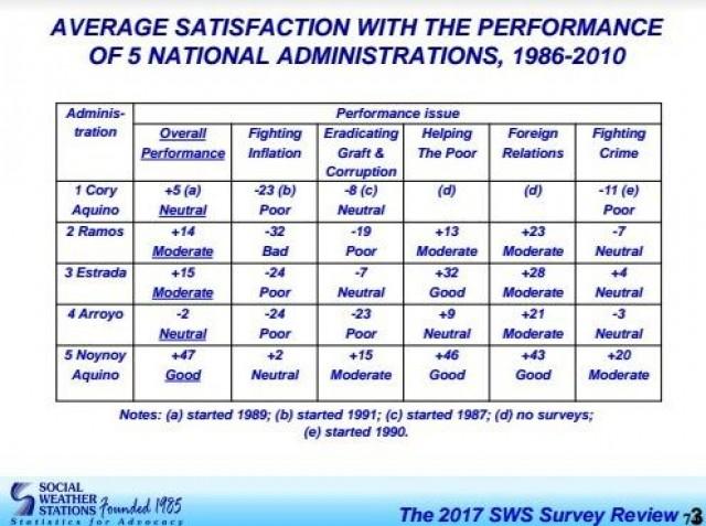 Aquino had a "good" average satisfaction rating in terms of his performance as a President, with an overall performance of +47. Meanwhile, Gloria Macapagal Arroyo received a -2 (neutral) rating; Joseph Ejercito Estrada had +15 (moderate); Fidel Ramos got +14 (moderate); and Corazon Aquino had +5 (neutral) rating.