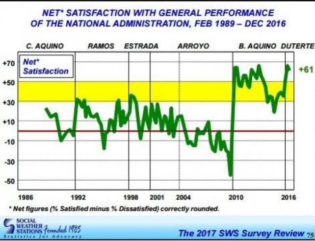 President Rodrigo Duterte is following suit, with a +61 net satisfaction rating in the last quarter of 2016, SWS said.
