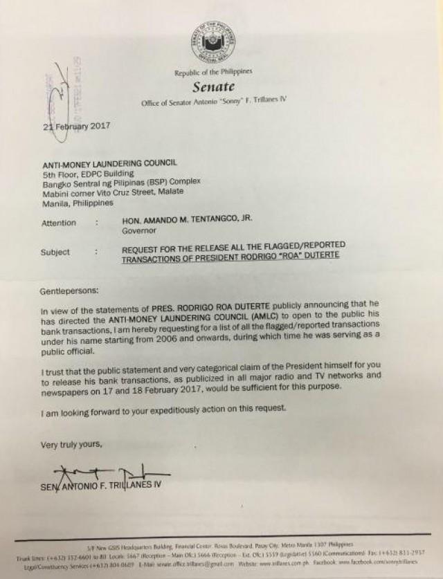 Senator Antonio Trillanes IV on Tuesday formally requested the Anti-Money Laundering Council (AMLC) to provide a list of all flagged or reported bank transactions of President Rodrigo Duterte from 2006 onwards.