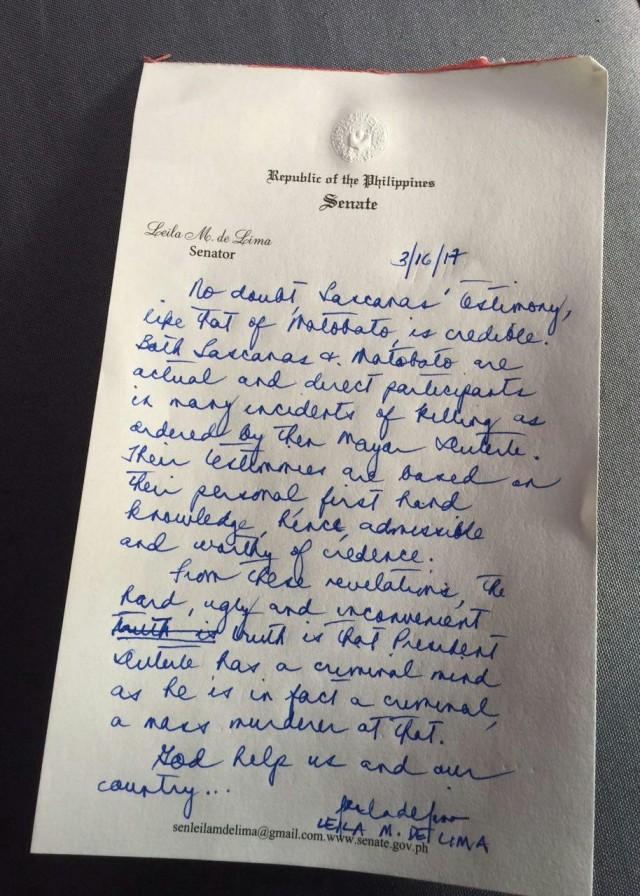 "No doubt Lascañas' testimony, like that of Matobato is credible. Both Lascañas and Matobato are actual and direct participants in many incidents of killings as ordered by the Mayor Duterte," De Lima, said referring to another confessed hitman Edgar Matobato.