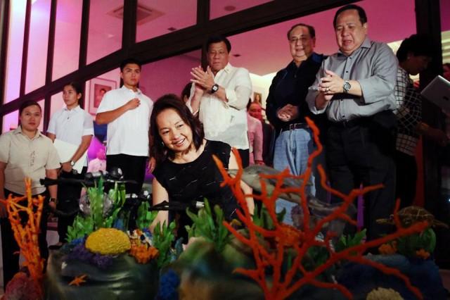 Former President and now Pampanga Rep. Gloria Arroyo admires the design of her cake during the celebration of her 70th birthday at La Vista Subdivision in Quezon City on Wednesday, April 5, 2017. President Rodrigo Duterte was one of the guests during Arroyo's birthday party. Also in the photo are the former First Gentleman Jose Miguel Arroyo and Senator Richard Gordon. Alfred Frias/PPD