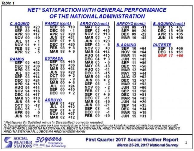 The results, which were first published on BusinessWorld, gave the Duterte administration a net satisfaction rating of +66, up by 5 points from the fourth quarter 2016 SWS survey result of +61 (73 percent satisfied, 12 percent dissatisfied).