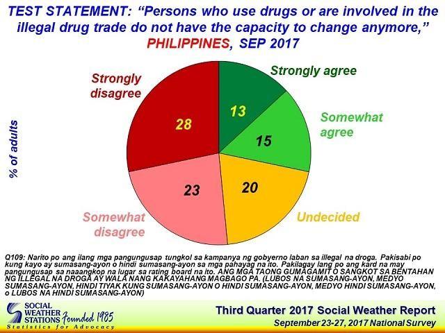 Meanwhile, the third quarter poll said 51 percent of Filipinos disagree (28 percent strongly disagree and 23 percent somewhat disagree) that drug suspects no longer have the capacity to mend their ways.
