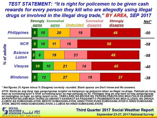 The survey results released on Tuesday showed that 65 percent of Filipinons—46 percent strongly disagree and 19 percent somewhat disagree—said it is wrong for cops of the Philippine National Police to receive cash rewards after conducting police anti-illegal drug operations.