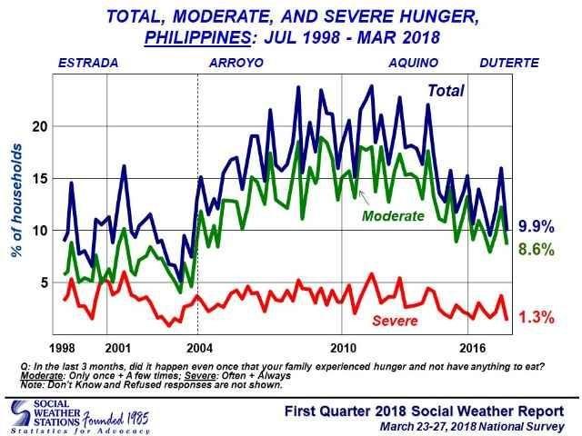 The SWS said the first quarter result was 6.0 points below the 15.9 percent quarterly hunger survey result in December 2017.