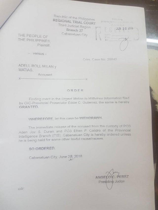 The Nueva Ecija Regional Trial Court has granted a motion to withdraw the case against Adel Roll Milan, one of the suspects in the killing of Catholic priest Richmond Nilo.