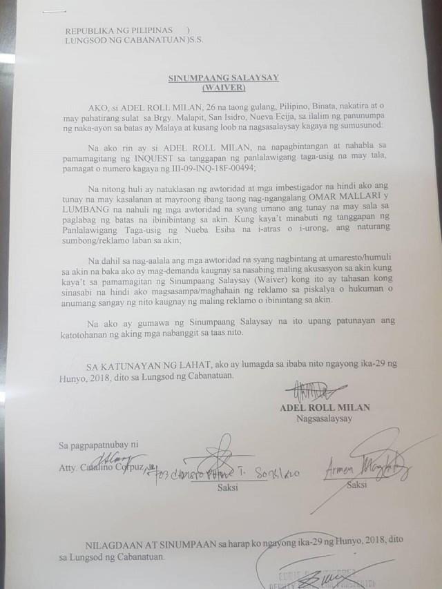 In his sworn affidavit, Milan said authorities dropped the charge against him after they arrested Omar Mallari, who they thought was the real suspect behind the killing.