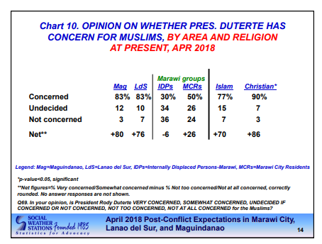 The poll, conducted April 12 to 15, also showed only 30 percent of Marawi residents living in internally displaced persons (IDP) camps were convinced of the chief executive's concern for the religious group.
