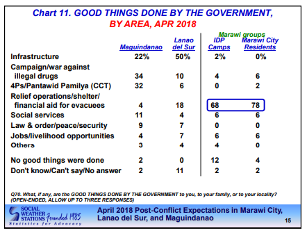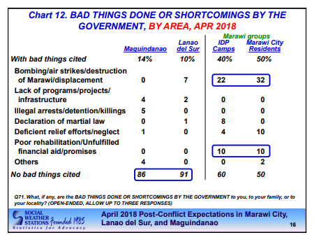 When asked about the "bad things done or shortcomings" by the government, the results were largely positive. However, the bombings, airstrikes, destruction of the city, and displacement were cited by the Marawi groups, along with "poor" rehabilitation and "unfulfilled" financial aid and promises.