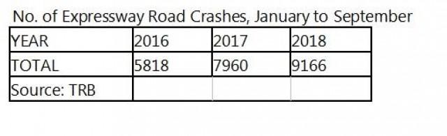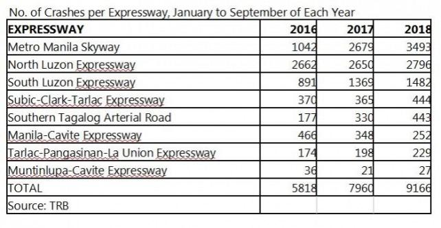 According to the TRB, the number of road crashes in eight expressways rose by almost 60 percent from 2016 to 2018.