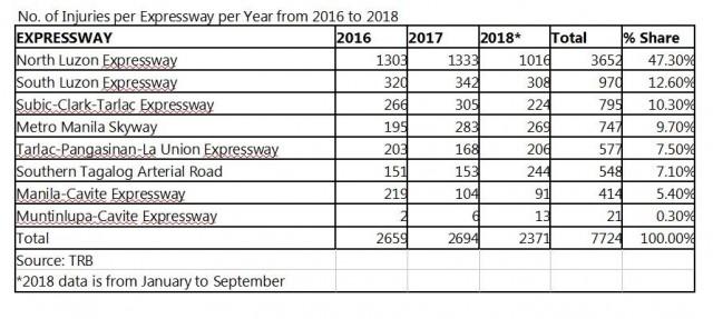 A total of 2,371 were wounded in road crashes along the expressways from January to September 2018. TRB data show that 47 percent of these injuries were sustained in NLEx.