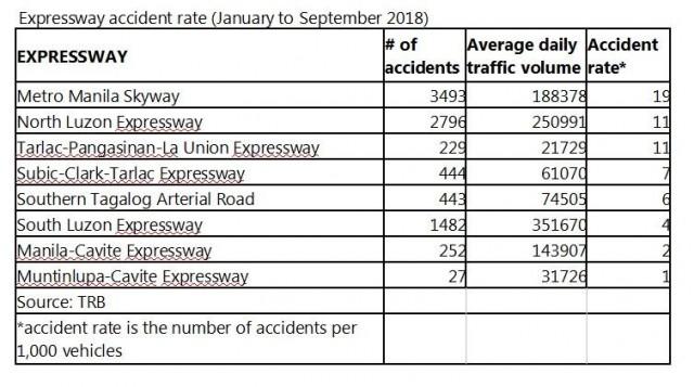 The TRB data cover incidents in Manila-CaviteExpressway (CavitEx), Metro Manila Skyway, Muntinlupa-Cavite Expressway (MCX), North Luzon Expressway (NLEx), South Luzon Expressway (SLEx), Southern Tagalog Arterial Road (STAR Tollway), Subic-Clark-Tarlac Expressway (SCTEx) and Tarlac-Pangasinan-La Union Expressway (TPLEx).