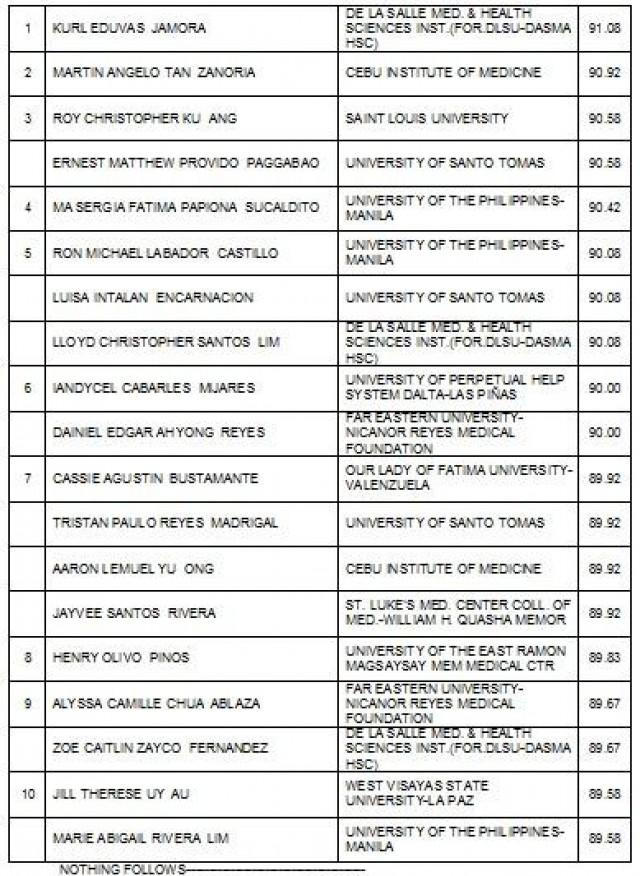 Kurl Eduvas Jamora got a score of 91.08 while Martin Angelo Tan Zamora of Cebu Institute of Medicine placed second with 90.92.
