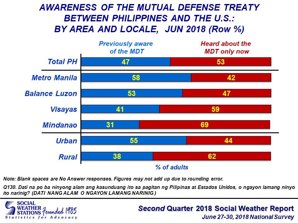 The same survey, however, revealed that only 47 percent are aware of the MDT between the Philippines and the United States while the rest 53 percent only became aware after the interview.