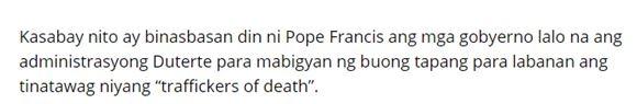 When translated to English, it says: “At the same time, Pope Francis blessed governments, especially the administration of Duterte, so they can be given more strength to fight what he calls ‘traffickers of death.’”