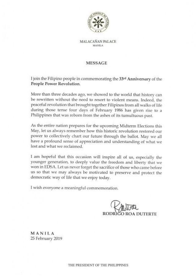 In his message on the eve of the 33rd Anniversary of the People Power Revolution, President Rodrigo Duterte called on citizens to remember that the revolt had restored the ballot, and thus made the upcoming midterm elections possible.