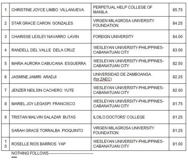 The successful examinees who garnered the ten (10) highest places in the