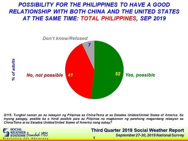 Figures showed 52% of adult Filipinos believe in the possibility of a good relationship with both countries, while 41% said it was not possible. Meanwhile, 7% did not have an answer.