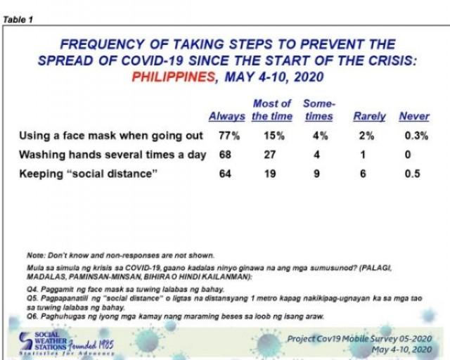 The SWS survey, conducted during May 4 to 10 thru mobile phone poll with 4,010 respondents aged 15 and above, also showed that 19% of Filipinos observe social distancing most of the time, while 9% sometimes observe physical distancing.