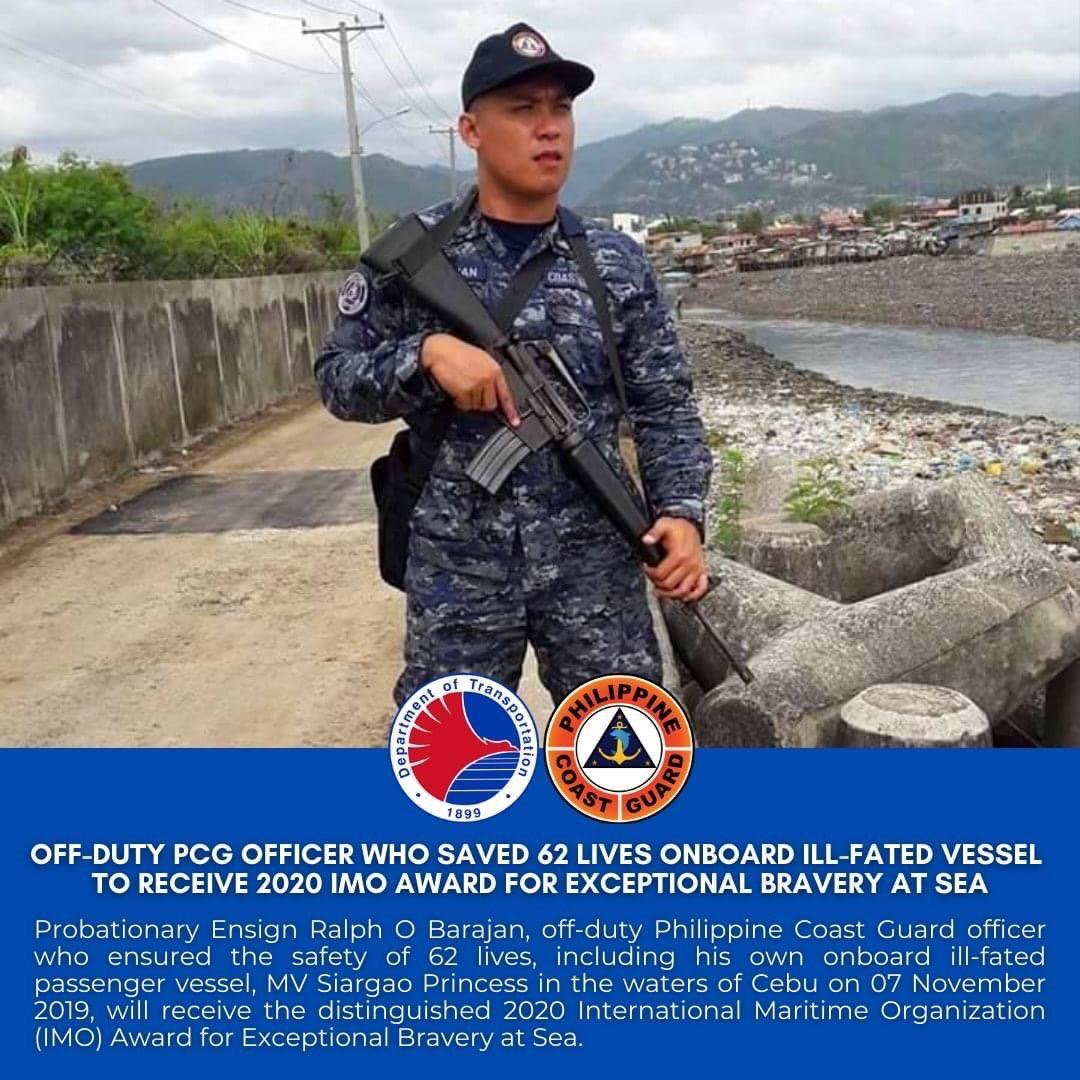 An officer of the Philippine Coast Guard is set to receive the distinguished International Maritime Organization (IMO) Award for Exceptional Bravery at Sea for rescuing all the passengers and crew of the capsized MV Siargao Princess last year.