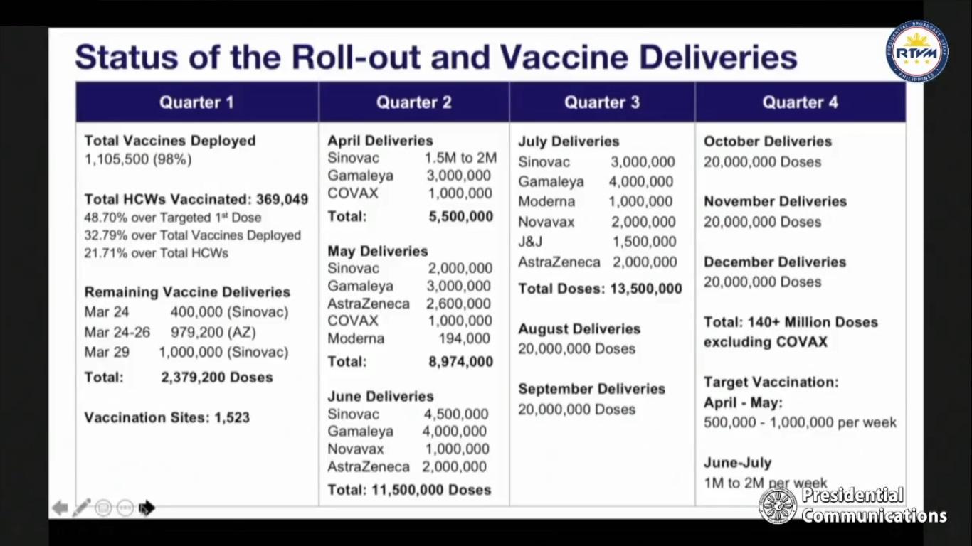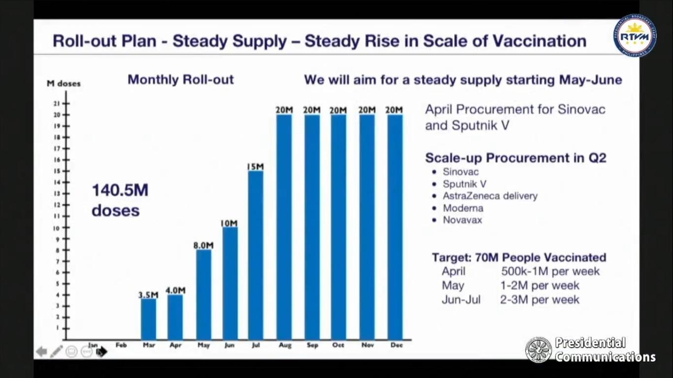 Galvez provided a chart of the expected vaccine deliveries and the corresponding increase in vaccinations. It shows that the government is targeting 500,000 to one million vaccinations per week in April, one million to two million per week in May, and two million to three million per week in June and July.