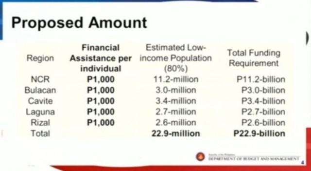 In Duterte's weekly talk to the people, Budget Secretary Wendell Avisado said a total of 22.9 million low-income individuals will receive P1,000 in kind under the dole out program.
