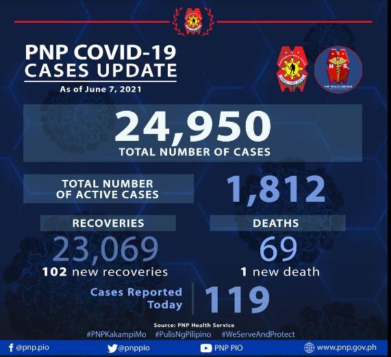 The number of coronavirus disease 2019 (COVID-19) cases within the Philippine National Police (PNP) rose to 24,950 on Monday with 119 more employees testing positive for the illness.