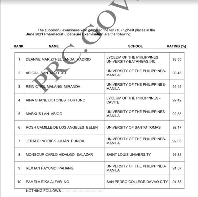 A graduate from the Lycuem of the Philippines in Batangas is the topnotcher for the June 2021 Pharmacist Licensure Examinations, the Professional Regulation Commission (PRC) announced.