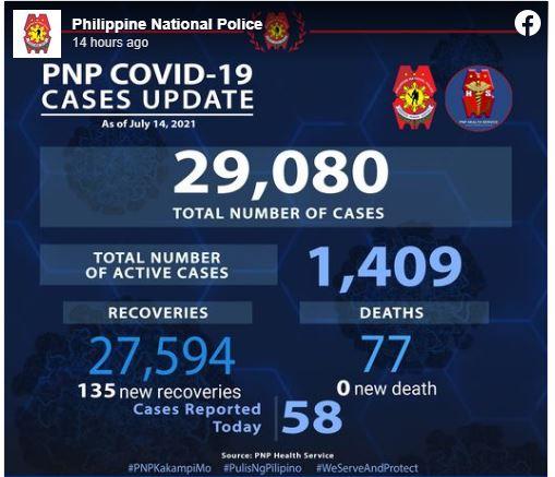 Fifty-eight more personnel of the Philippine National Police (PNP) have tested positive for the coronavirus disease 2019 (COVID-19) on Wednesday, bringing the total to 29,080, according to the agency.