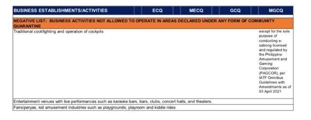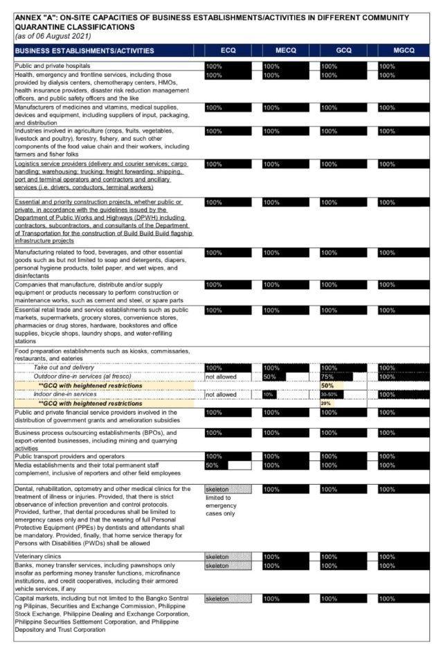 “With the community quarantine classifications approved under IATF Resolution No. 130-A and 130-D, Series of 2021 for the period of 1 August 2021 to 31 August 2021, please be advised of the allowable on-site operational or venue/seating capacity of business establishments/activities under the various community quarantines,” the DTI Advisory No. 21-16, series of 2021, issued on August 6 read.