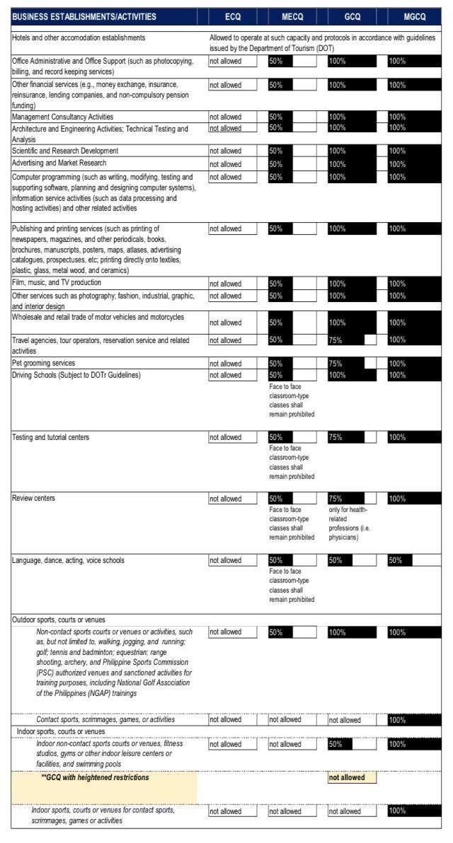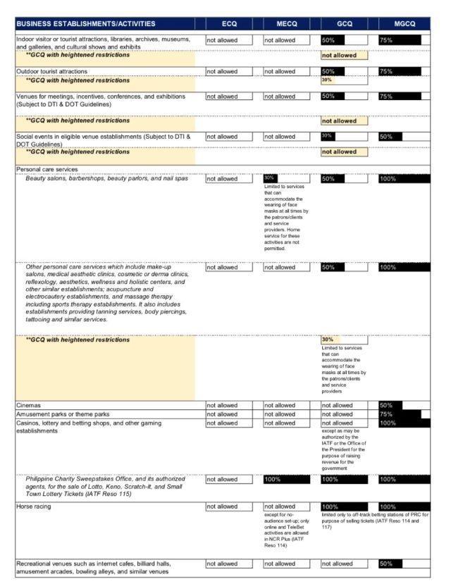 Allowed on-site, venue capacity of biz establishments under various community quarantines