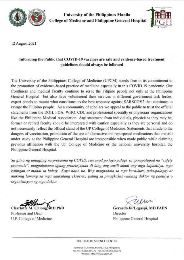 The Philippine General Hospital and University of the Philippines College of Medicine also issued a statement assuring the public that COVID-19 vaccines are safe and evidence-based treatment guidelines should always be followed.