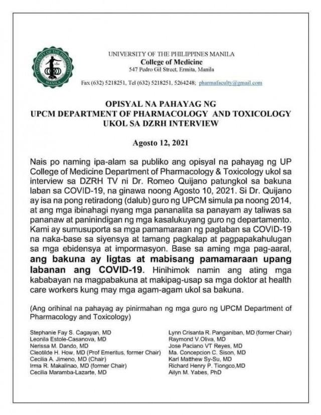 Quijano's former colleagues at the UP College of Medicine Pharmacology and Toxicology Department also issued a statement.