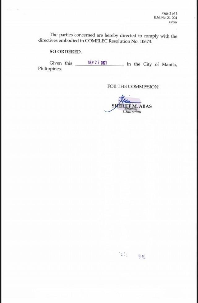 In the poll body's order dated September 22, which was shared by the Cusi group on Thursday, the Pacquiao-Pimentel faction was directed to answer the petition within five days from receipt of the document.