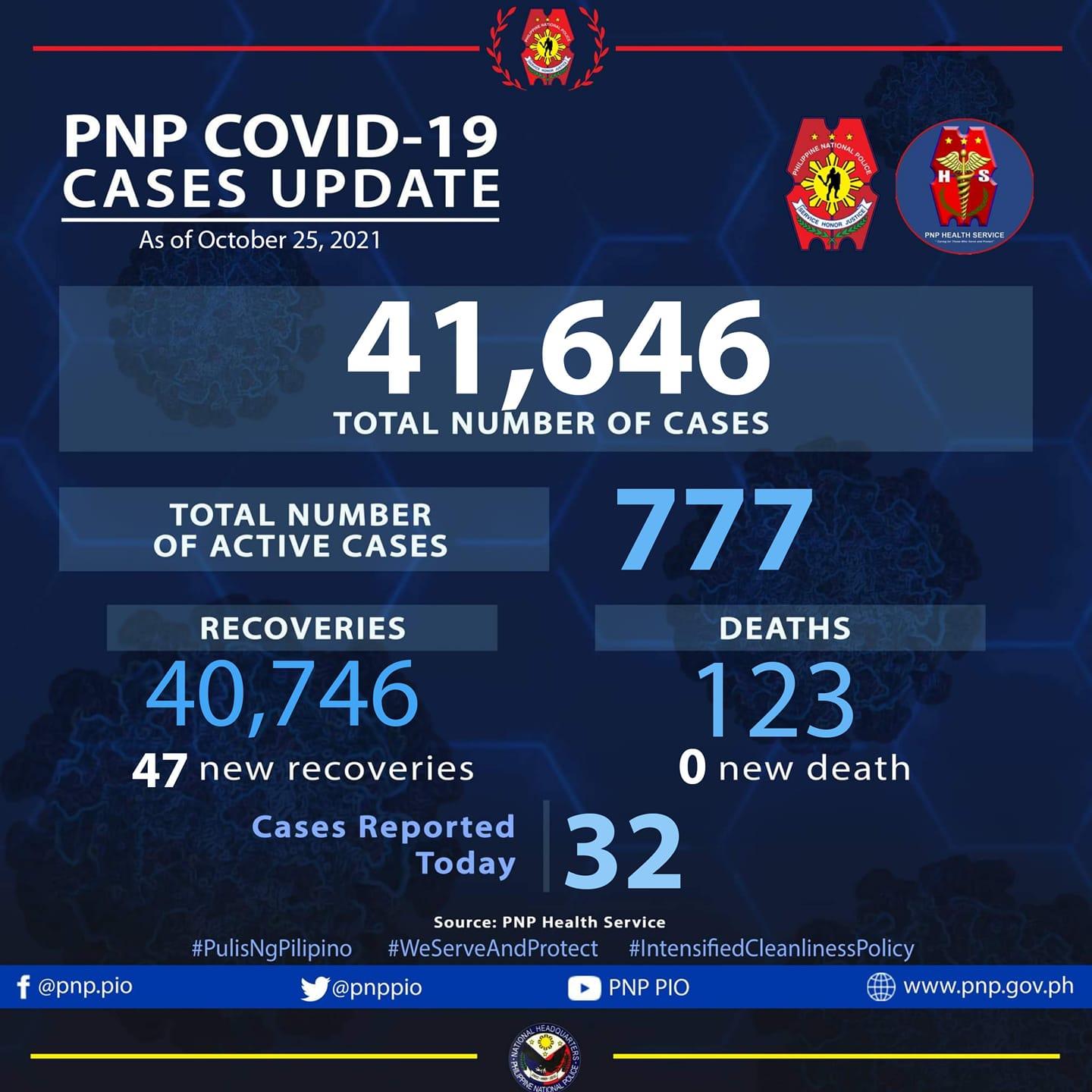 The Philippine National Police (PNP) recorded an additional 32 cases of COVID-19 among its personnel, bringing the total number of infections to 41,646 as of Monday.