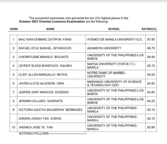 Complete list of passers October 2021 Chemical Technician Licensure Examination -- BAP, GMA News