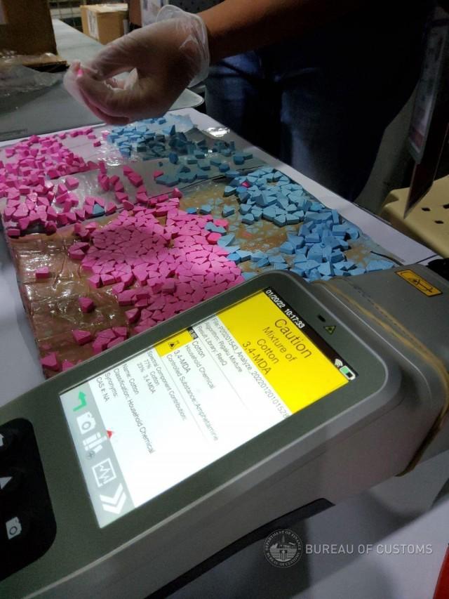 Further inspection on the six plastic pouches revealed about 10 grams of broken pieces of blue and pink tablets suspected to be party drugs or ecstasy, the BOC added.