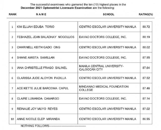 A graduate from Centro Escolar University (CEU) in Manila gained the highest percentage rating in the December 2021 Optometrist Licensure Examinations, the Professional Regulation Commission (PRC) announced Monday.